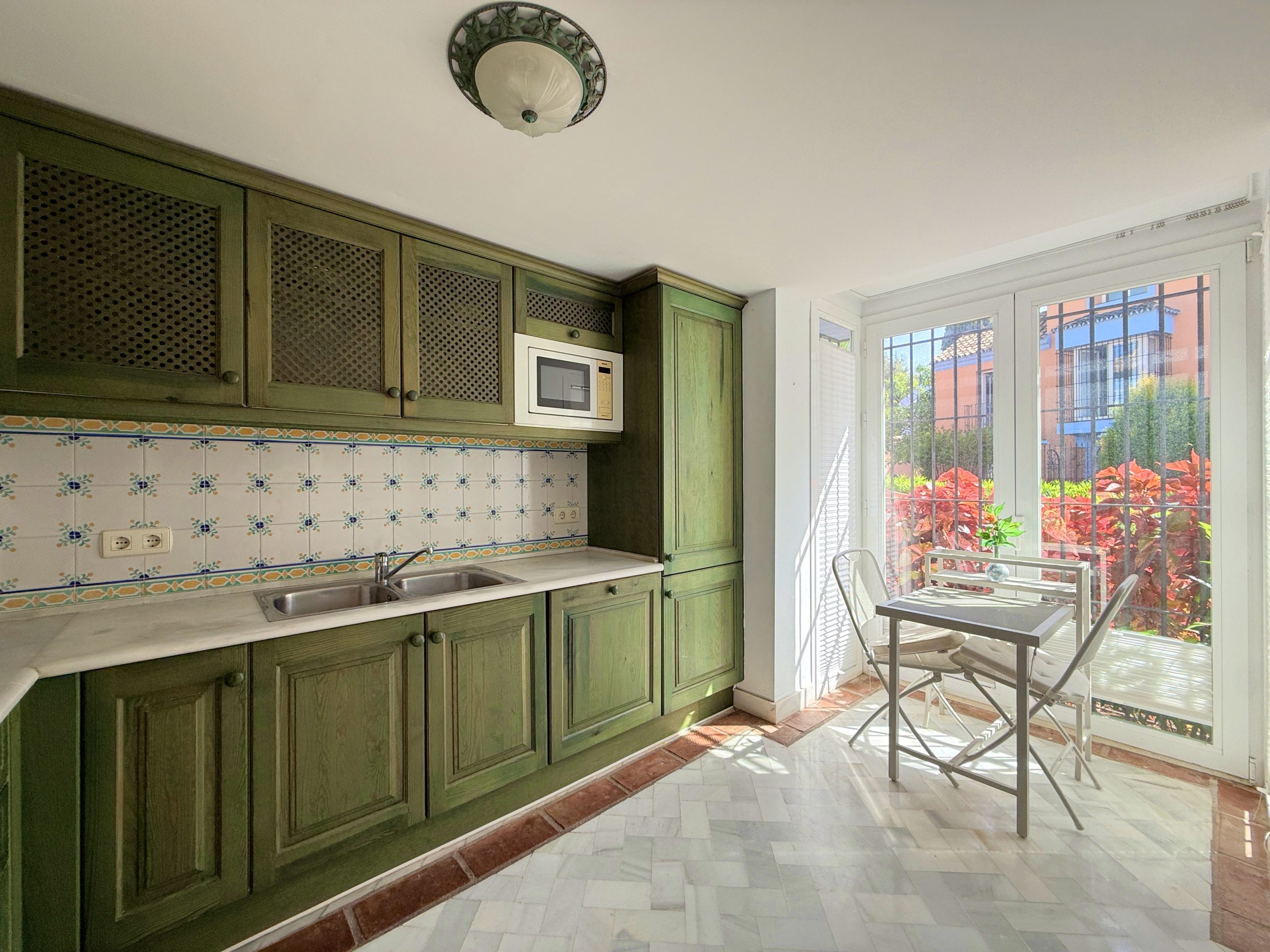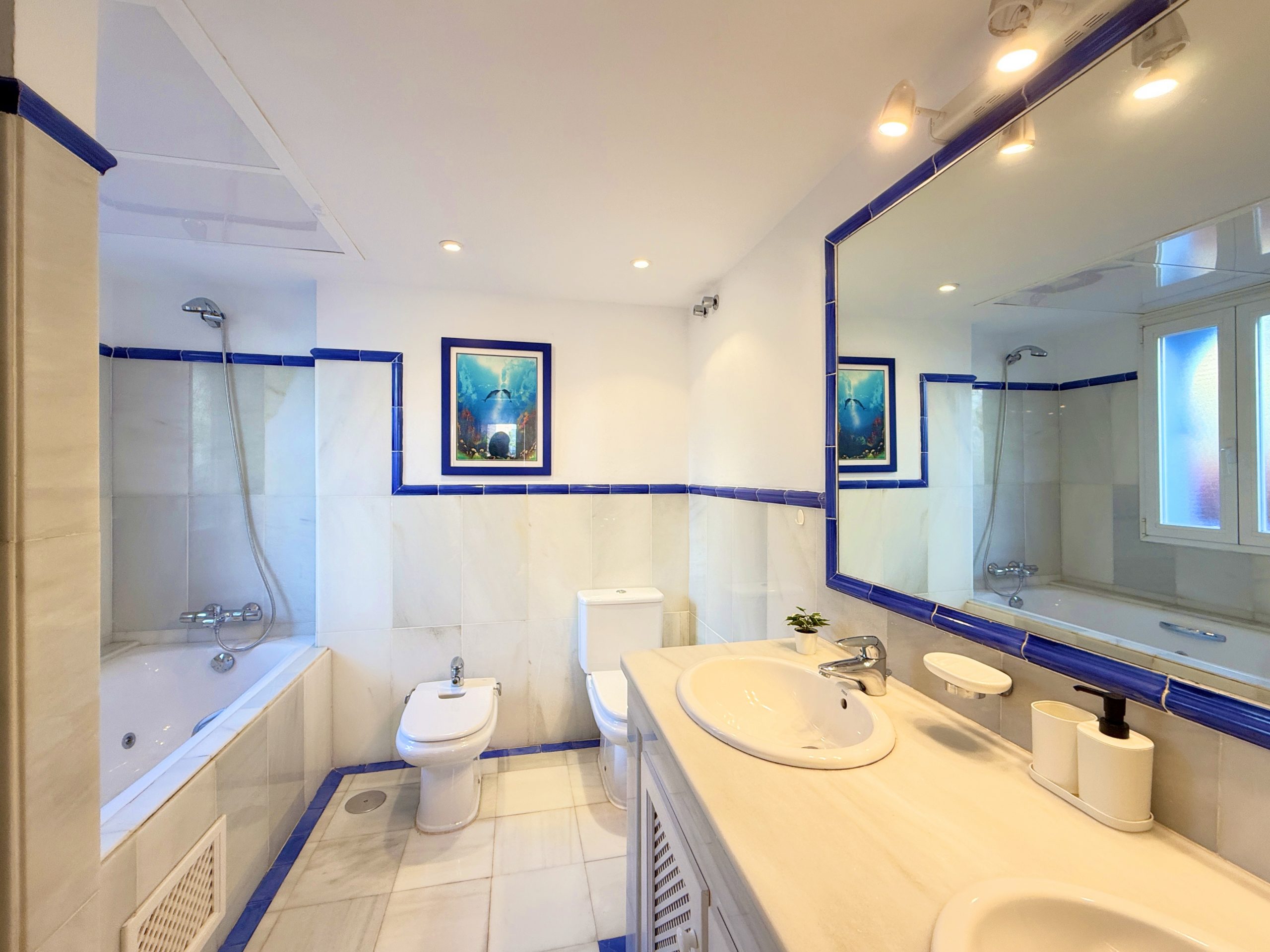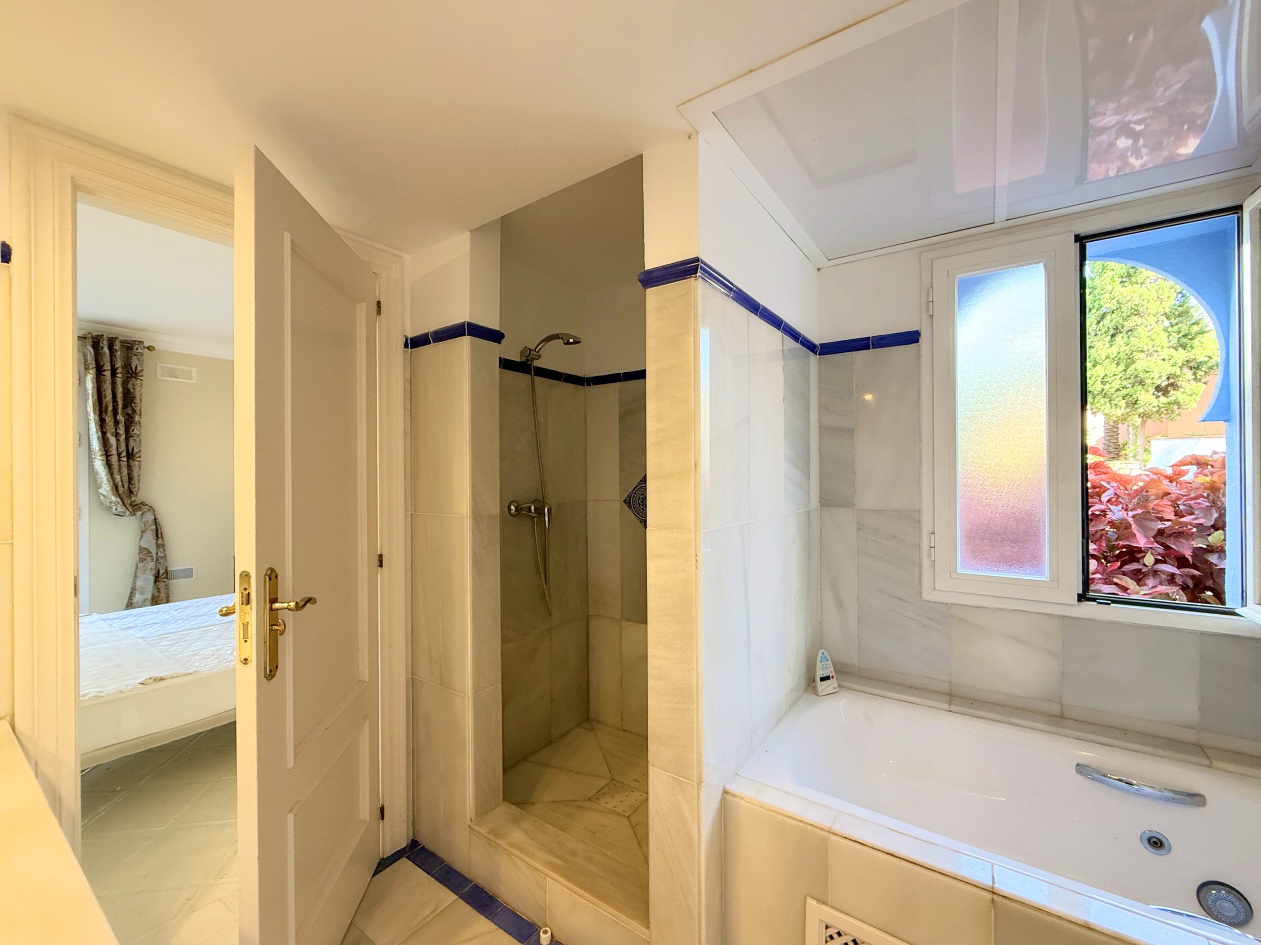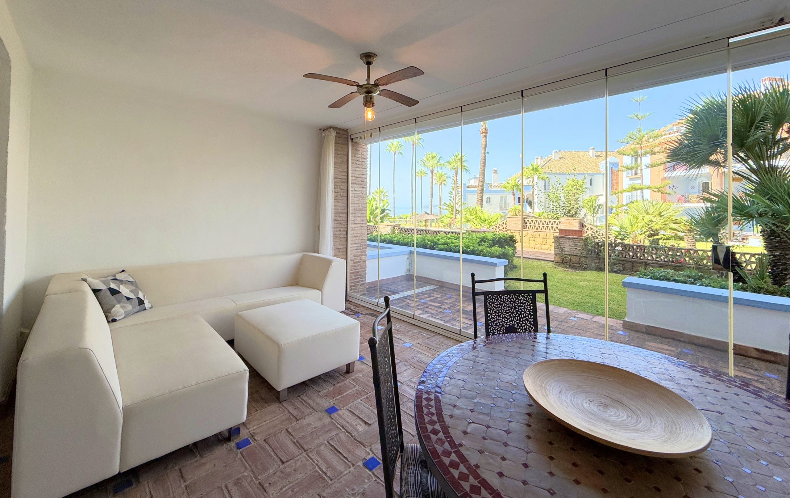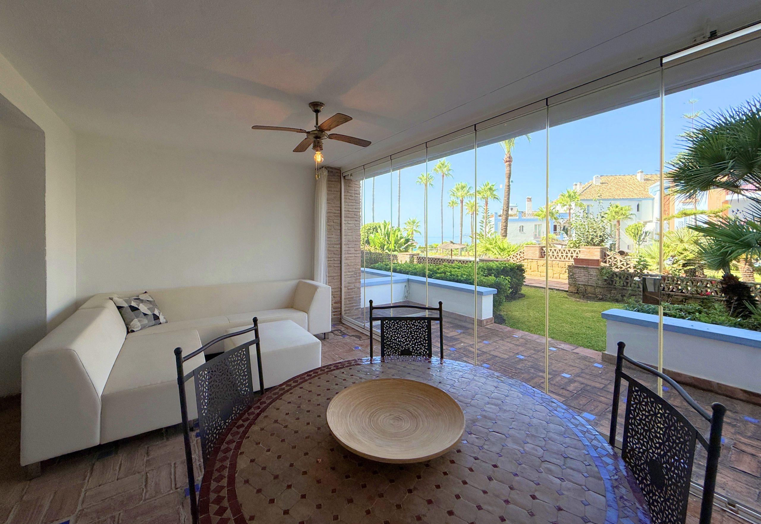 NUEVO EN EL MERCADO: IMPRESIONANTE APARTAMENTO EN 1ª LINEA DE PLAYA, EN PLANTA BAJA, ESQUINA y con JARDÍN PRIVADO perfectamente mantenido por la comunidad, con ESPECTACULARES VISTAS AL MAR, LA PLAYA, GIBRALTAR Y ÁFRICA. Situado en la hermosa Bahía de Casares, junto a una zona histórica protegida con una antigua torre árabe, dentro del precioso complejo La Perla de la Bahía de precioso diseño fusionando los estilos andaluz y árabe. Rodeado de exuberantes jardines, magníficas piscinas (2 climatizadas), gran variedad de fuentes decorativas y zonas de descanso diseñadas para el máximo disfrute. A solo 2 minutos caminando de 3 playas diferentes, 2 restaurantes de renombre y el prestigios complejo de golf Finca Cortesín galardonado cada año como el Mejor Resort de Golf de España, dentro de los 50 mejores campos de golf del mundo y sede de la prestigiosa competición Solheim Cup en 2023 entre otras. Estratégicamente situado entre Estepona y el encantador Puerto de la Duquesa y el pueblo de Sabinillas, todo a solo 5 minutos en coche, lo que ofrece acceso a una amplia variedad de tiendas, restaurantes, actividades de ocio y diferentes campos de golf, La comunidad cerrada ofrece seguridad 24 horas y videovigilancia, garantizando tranquilidad y seguridad. Esta propiedad incluye 2 plazas de parking en garaje y 1 amplio trastero. Todo esto la convierte no solo en una residencia de ensueño, sino también en una destacada oportunidad de inversión con alto potencial de alquiler. ¡Una propiedad única que debe ser vista!